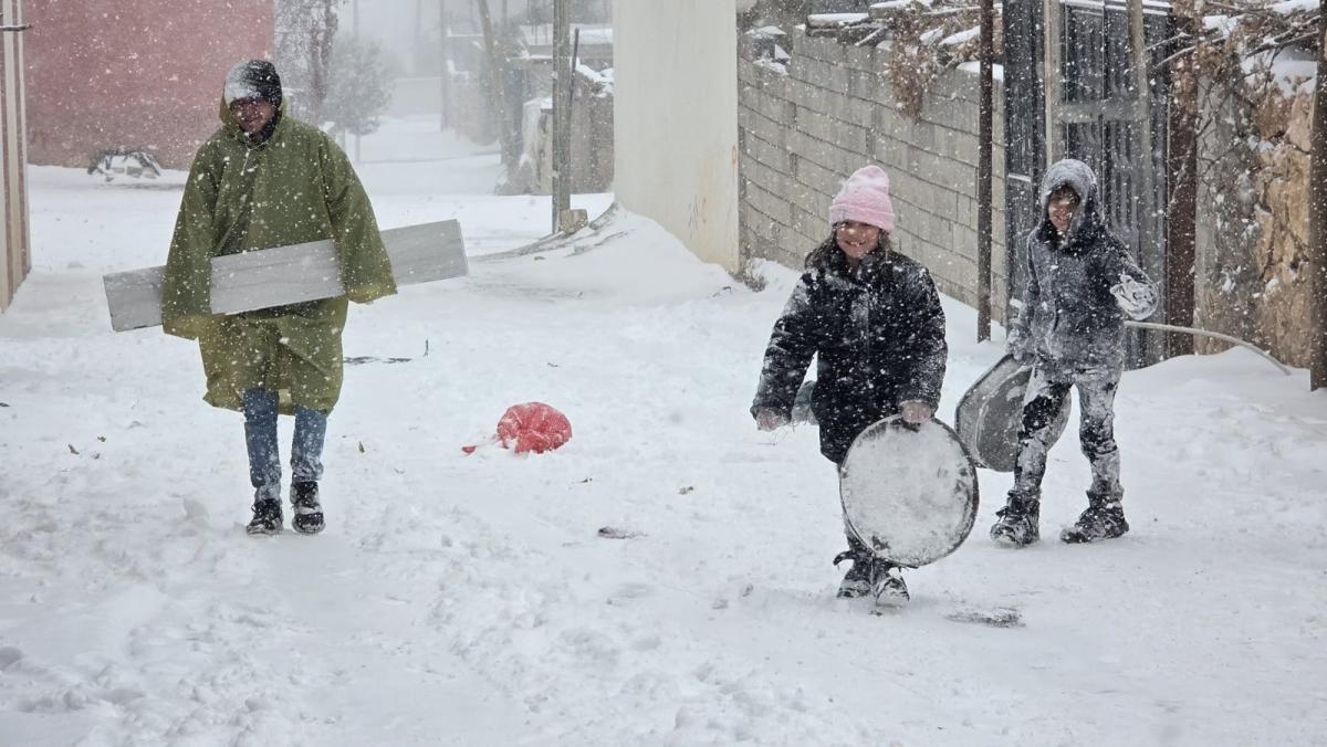 Adıyaman'ın Gerger ilçesinde etkili olan kar yağışı sonrası okulların tatil edilmesi, çocuklara eğlenceli anlar yaşattı. İlçede güne karla uyanan çocuklar, baklava tepsisi, palet ve varilleri keserek yaptıkları kaygan araçlarla yokuşlardan kaydı.