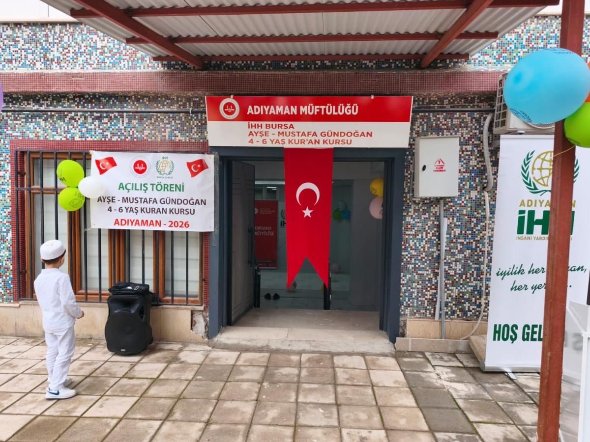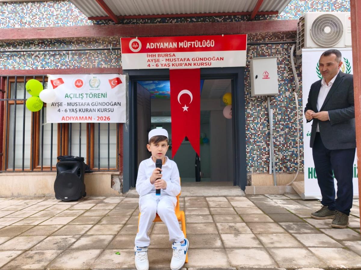 Adıyaman Müftülüğü ile İHH'nın iş birliğinde hayata geçirilen Ayşe-Mustafa Gündoğan 4-6 Yaş Kur'an Kursu'nun açılış programına Adıyaman İl Müftü Yardımcısı Hilmi Benli, İl Milli Eğitim Müdürü Ali Tosun, Bursa İHH Şube Başkanı Hüseyin Kaplan, Adıyaman İHH Başkanı Mücahit Tekin, Bursa İHH Şube Müdürü Abdulmelik Yalvarıcı, sivil toplum kuruluşu temsilcileri ve çok sayıda vatandaş katıldı.