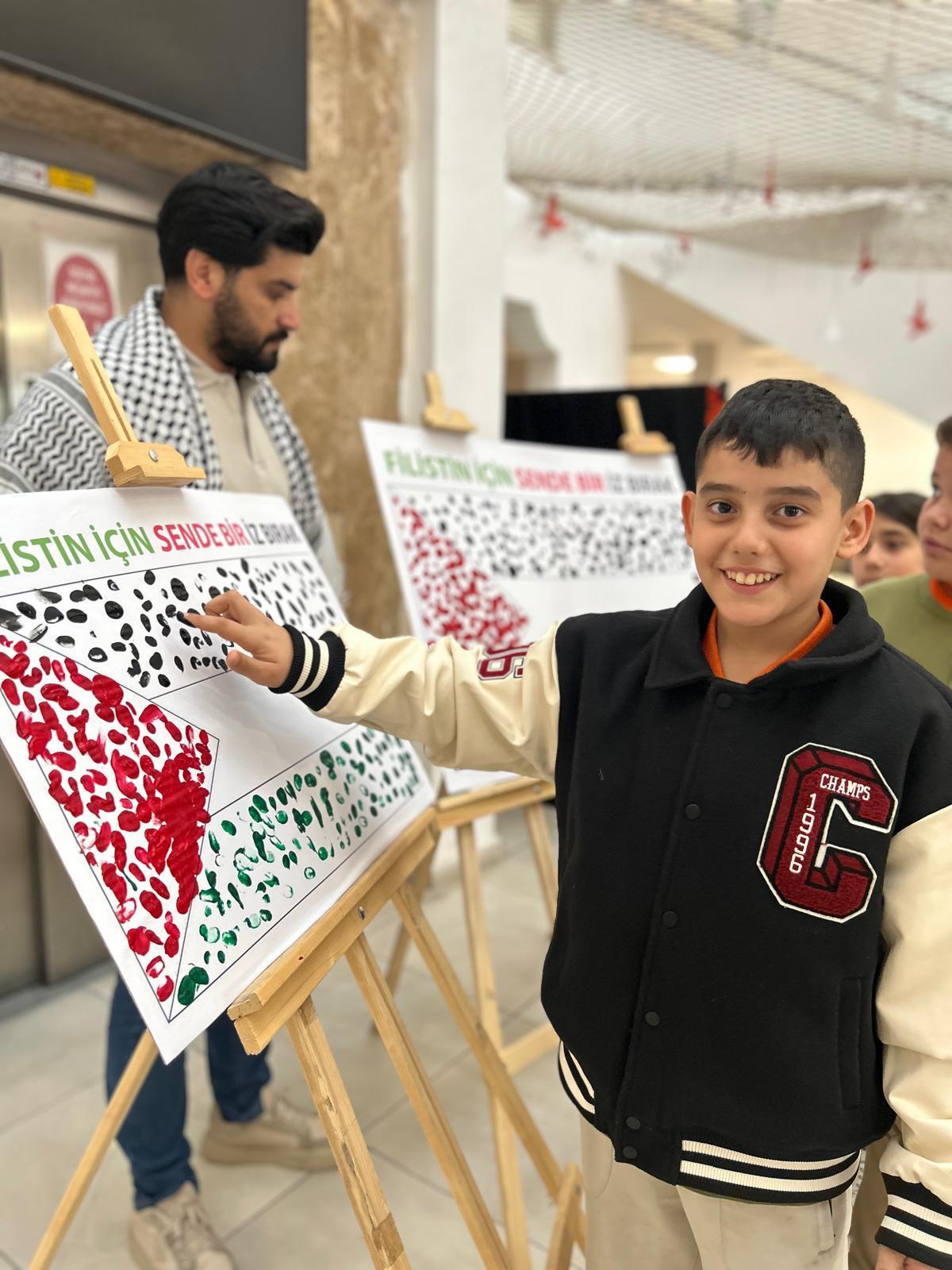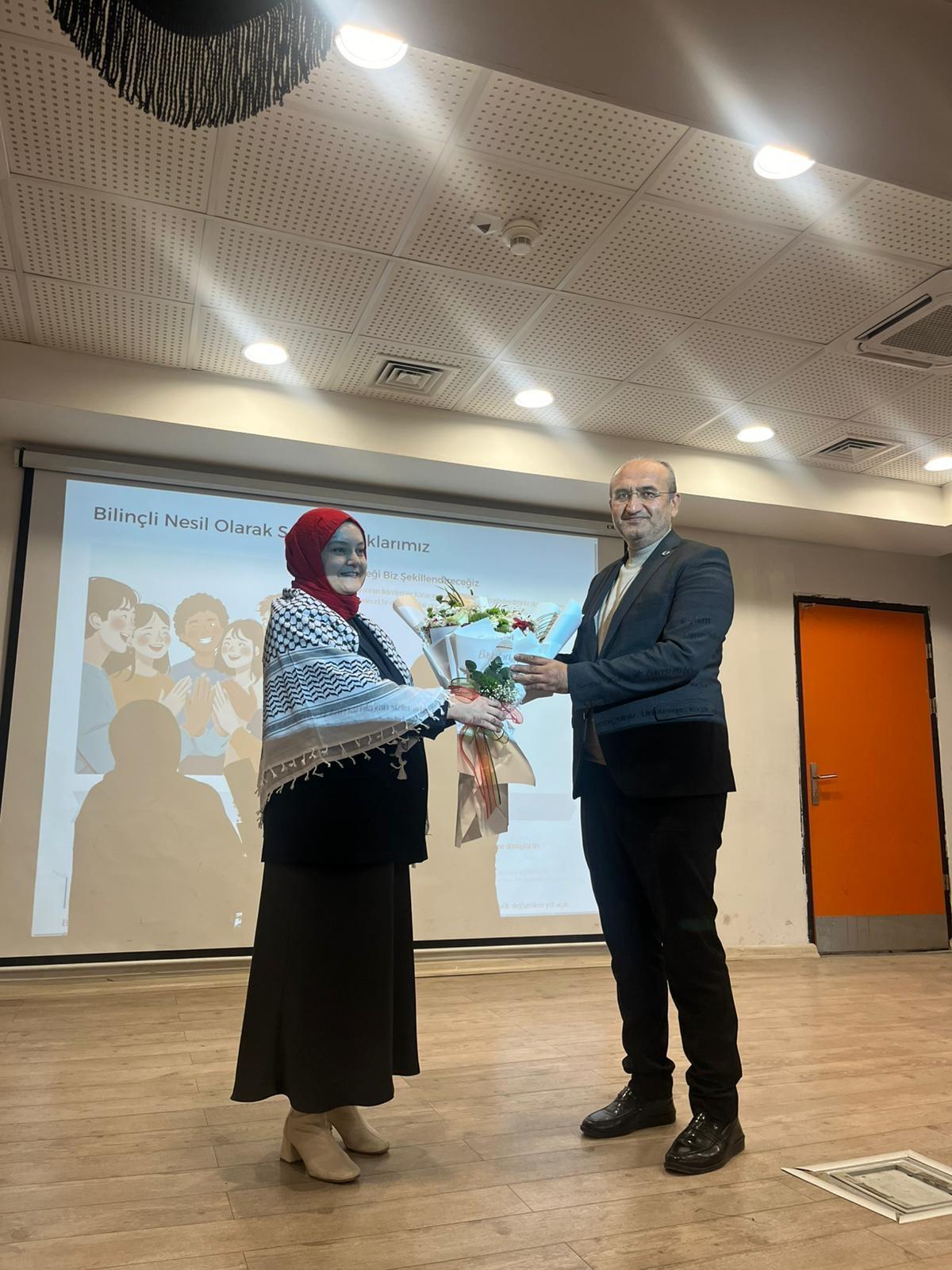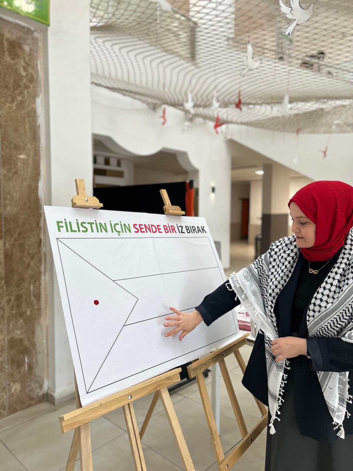 Program, öğrencilerin aktif katılımıyla sunumlar ve "Filistin İçin İz Bırak" etkinliğiyle devam etti. Etkinlik sonunda öğrencilere Filistin renklerinde balonlar ve bayraklar dağıtılırken, Hüseyin Yılmaz'a teşekkür çiçeği takdim edildi.