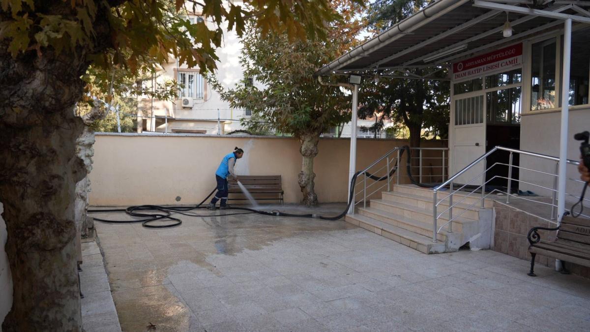 Sabahın erken saatlerinden itibaren sahaya çıkan ekipler, cami ve mescitlerde detaylı temizlik gerçekleştiriyor. Son olarak Bahçelievler Mahallesi'ndeki İmam Hatip Lisesi Camii'nde halılar yıkanırken, bahçe alanı tazyikli suyla temizlendi. Ardından Adıyaman Üniversitesi Devlet Konservatuvarı Mustafa Kahtalı (Kahtalı Mıçe) binasında bulunan mescitte ekipler halıları yerinde yıkadı.