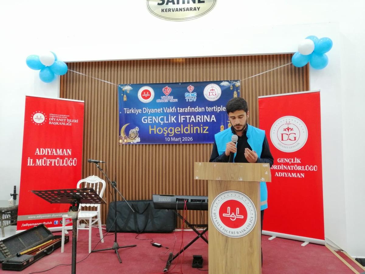 Türkiye Diyanet Vakfı (TDV) Adıyaman Şubesi Genç TDV ekibi, Kervansaray Düğün Salonu'nda yaklaşık 450 üniversite öğrencisinin katılımıyla iftar programı gerçekleştirdi. Programa TDV Gençlik Hizmetleri Müdürü Halil Rahman Çakır, Başkanlık Müftüsü Mehmet Taştan, ADYÜ İlahiyat Fakültesi Dekanı Prof. Dr. Mehmet Sait Uzundağ, Müftü Yardımcıları Hilmi Benli ve Dr. Sabahat Saylık, Veysel Karani Öğrenci Yurdu Müdürü Hüseyin Sonkaya, şube müdürleri, din görevlileri ve çok sayıda üniversite öğrencisi katıldı.