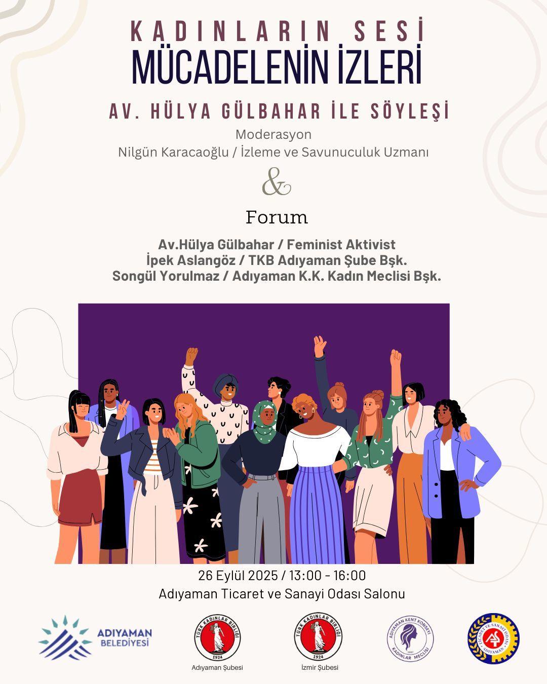 Adıyaman Ticaret ve Sanayi Odası’nda gerçekleştirilen etkinliğe feminist aktivist Av. Hülya Gülbahar, TKB Adıyaman Şube Başkanı İpek Aslangöz, TKB İzmir Şube Başkanı Sevtap Şirin, Adıyaman Kent Konseyi Başkanı Dr. Erdoğan Altunbaş ve Kadın Meclisi Başkanı Songül Yorulmaz konuşmacı olarak katıldı. Söyleşinin moderatörlüğünü ise izleme ve savunuculuk uzmanı Nilgün Karacaoğlu üstlendi.