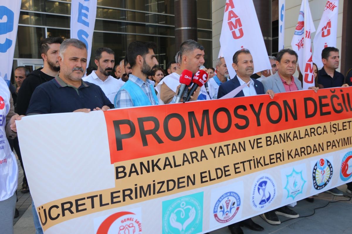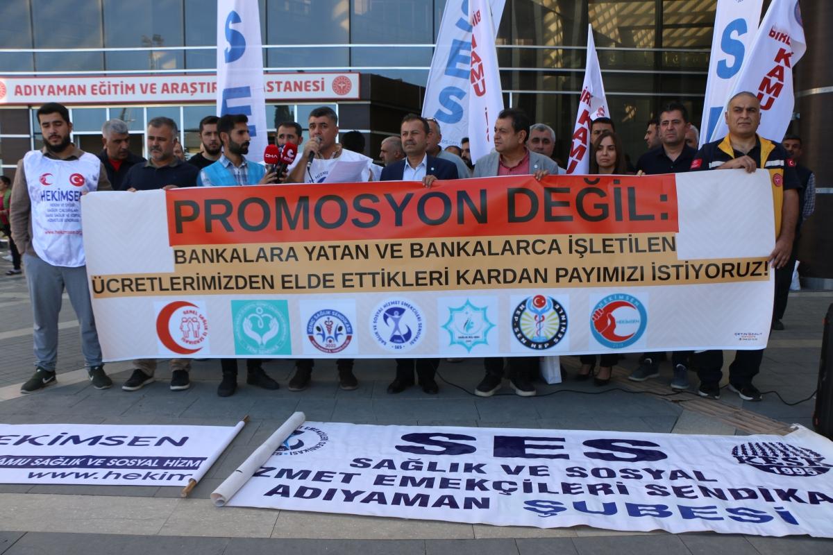 Adıyaman Eğitim ve Araştırma Hastanesi önünde bir araya gelen Genel Sağlık-İş, Yenilikçi Sağlık ve Sosyal Hizmet Çalışanları Sendikası, Genç Sağlık-Sen, Hep-Sen, Sağlık Mil-Sen, Hekim-Sen, Sağlık ve Sosyal Hizmet Emekçileri Sendikası, ortak basın açıklaması düzenledi. Sendikalar, "Bankaların emek üzerinden kazandığı kârın payı bize aittir" diyerek promosyon ihalesine tepki gösterdi.