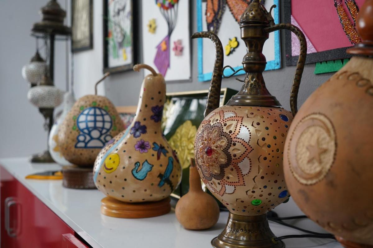 Üretim atölyesinde eğitim gören 30 öğrenci; gazoz kapakları, ahşap mandallar, kâğıt, pamuk ve kumaş gibi geri dönüşüm malzemelerini kullanarak dekoratif ürünler tasarlıyor. Ahşap boyama, taş süsleme, abajur yapımı ve elyaftan süs kutuları gibi farklı alanlarda üretim yapan öğrenciler, her çalışmayla yeni bir tasarımı hayata geçiriyor.