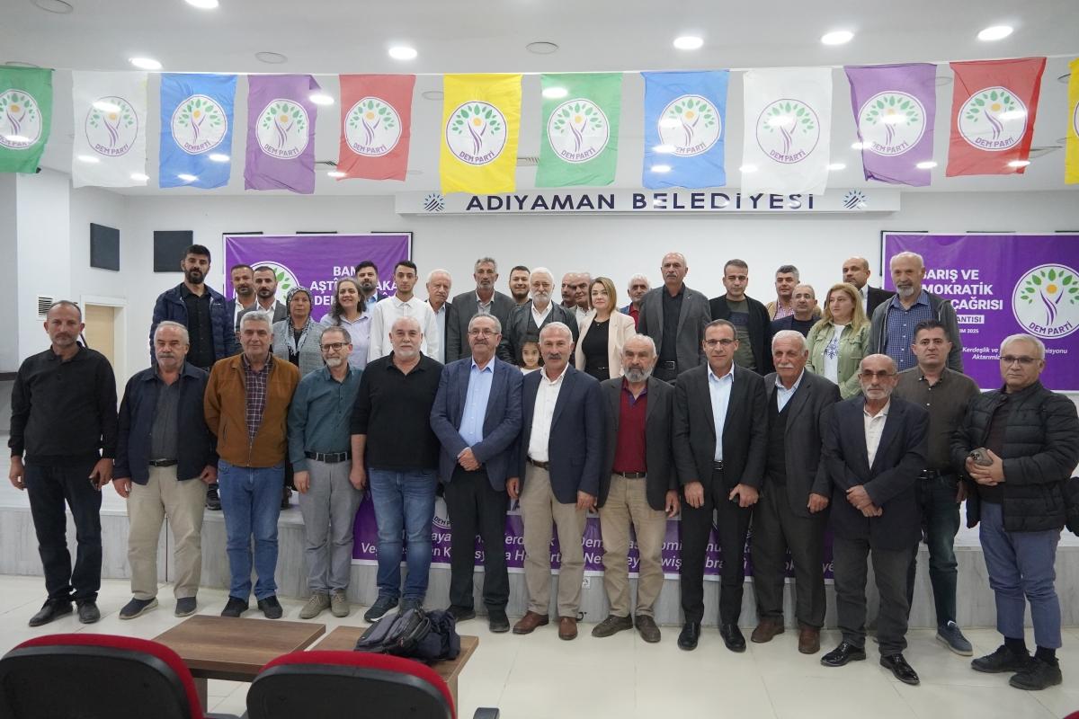 DEM Parti Adıyaman İl Eş Başkanı Mehmet Bayır, yaptığı konuşmada barışın önemine dikkat çekerek, "Evet, bugün burada barışı konuşmak, barışın özlemini duyduğumuz bir yaşamı kendimize esas almak için buradayız. Barışın savaştan daha zor bir durum olduğu herkes tarafından bilinir. Tabii bu barış için büyük emekler gerekiyor. Bu emekleri uğruna bedel ödeyen, çaba sarf eden değerli katılımcı arkadaşlarımız da var. Aynı zamanda bu emeği bize sunan, barışçı ve demokratik toplum inşası konusunda Sayın Abdullah Öcalan'ın önümüze koymuş olduğu bir perspektifi, toplumca bu sorunun barışa evrilmesi konusunda herkes elinden geleni yapmaya çalışıyor. Evet, yine söylüyoruz, barış kolay bir şey değildir. Barış için emek lazım. Bu emek uğruna çaba gösteren Sırrı Süreyya Önder, Adıyamanlı bir yoldaşımızdı. Bu barış süreciyle ilgili büyük bedel verdi ve yaşamını bu uğurda kaybetti. Onu da bu salonda yad ediyoruz. Söz konusu barış olunca konuşulması gereken çok şey var. Bugün bu barışı konuşmak için komisyonlarımız da oluşturulmuştur. Milli Dayanışma, Kardeşlik ve Demokrasi Komisyonu'nda Antalya Milletvekilimiz Saruhan Oluç tam da bu sürecin merkezinde yer alıyor" dedi.