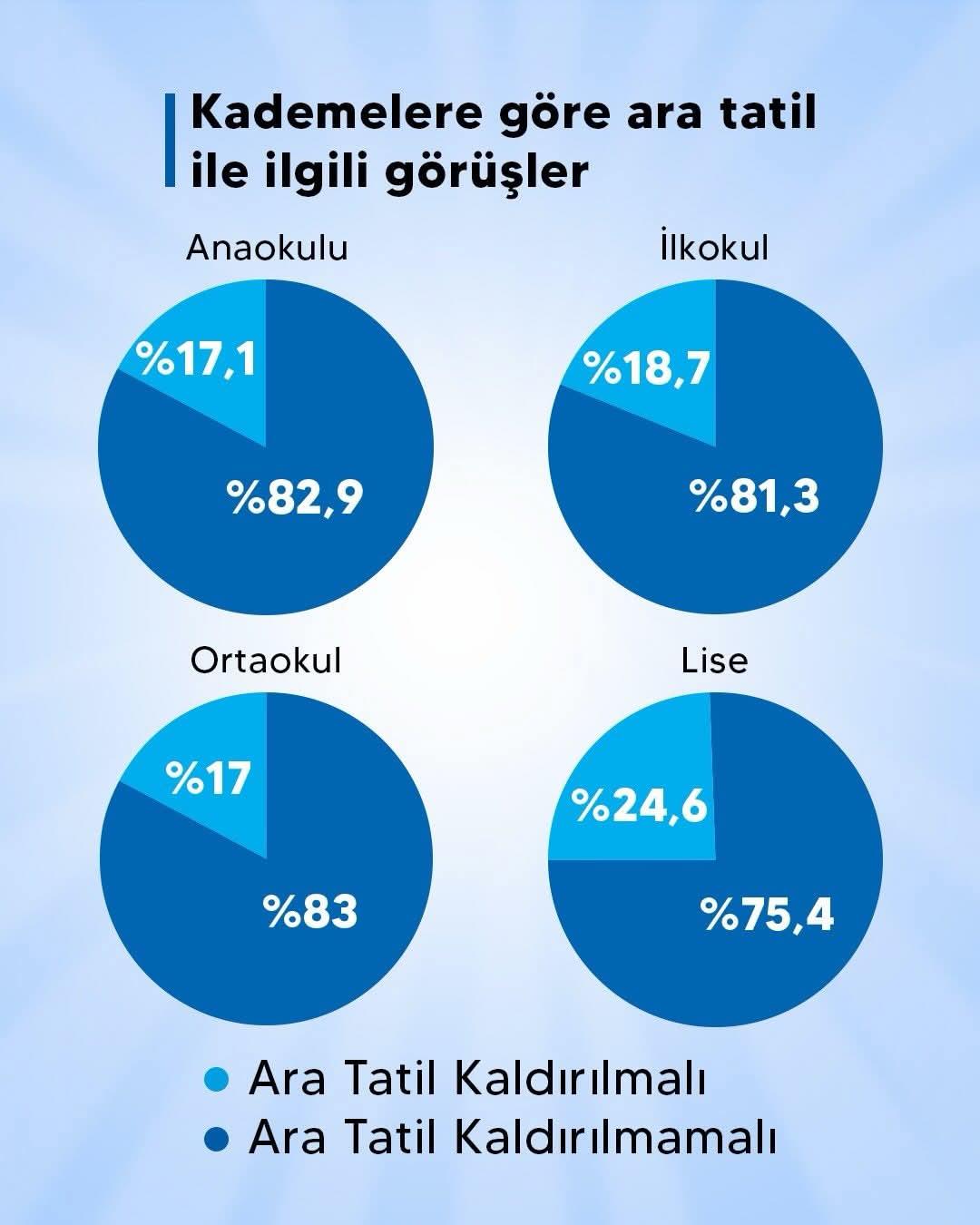 Araştırmada katılımcılara yöneltilen "Birer haftalık ara tatiller kaldırılmalı mıdır?" sorusuna verilen yanıtlar dikkat çekici bir tablo ortaya koydu. Katılımcıların %80,5'i ara tatillerin kaldırılmaması gerektiğini ifade ederken, %19,5'i ise kaldırılması gerektiğini belirtti.