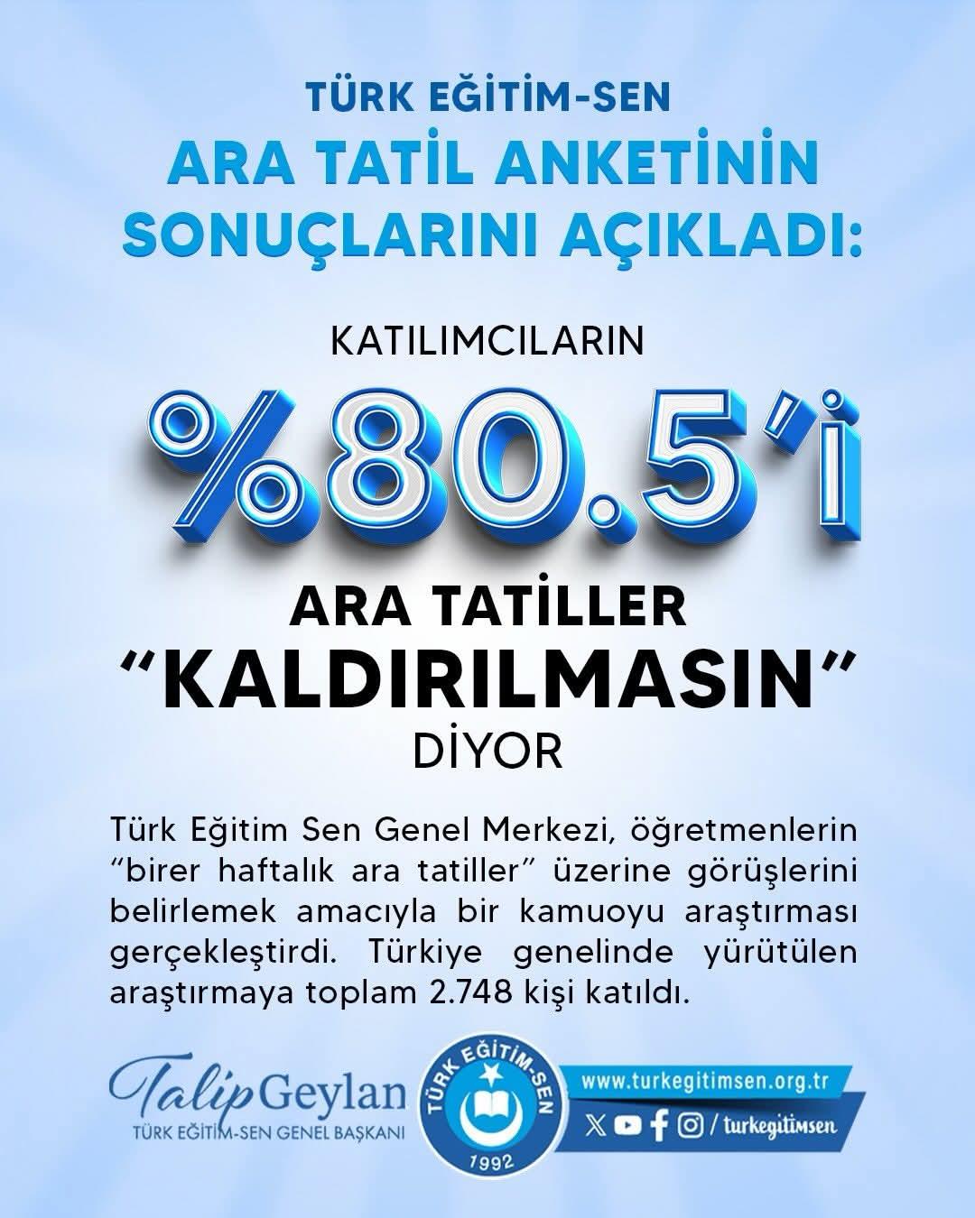 Araştırmayı değerlendiren Türk Eğitim-Sen Genel Başkanı Talip Geylan ise öğretmenlerin büyük çoğunluğunun ara tatillerin kaldırılmasına karşı olduğunu belirtti.