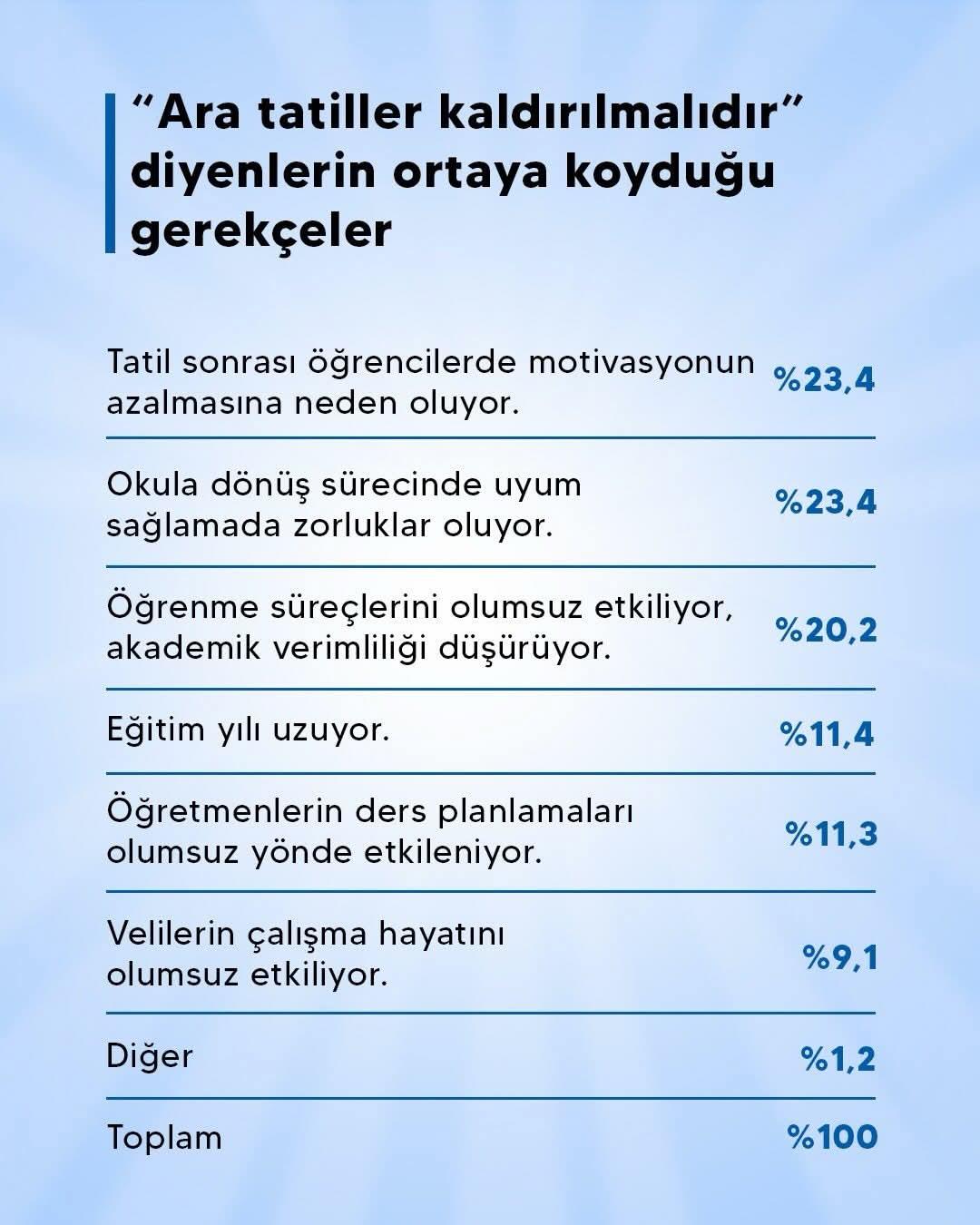 Araştırmada ara tatillerin kaldırılmasını isteyen katılımcıların gerekçeleri de ortaya kondu. Buna göre en çok belirtilen nedenler şöyle oldu: