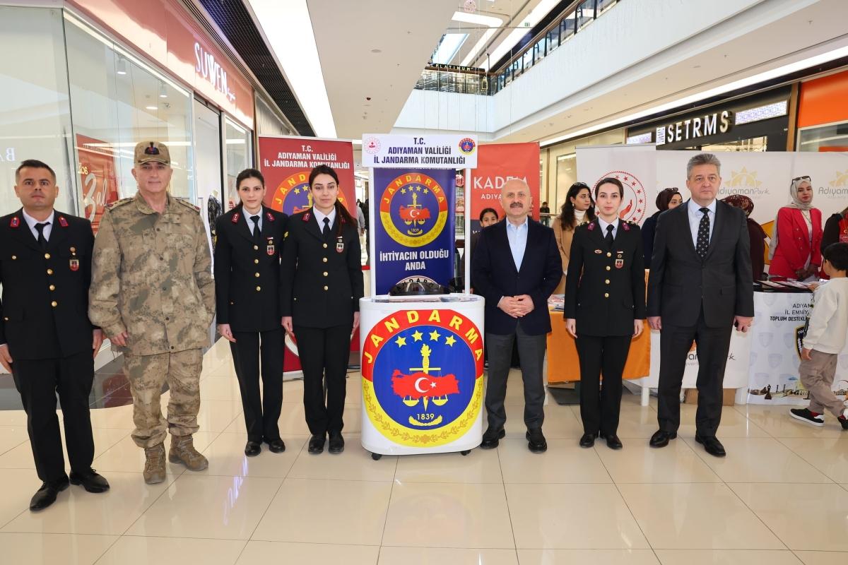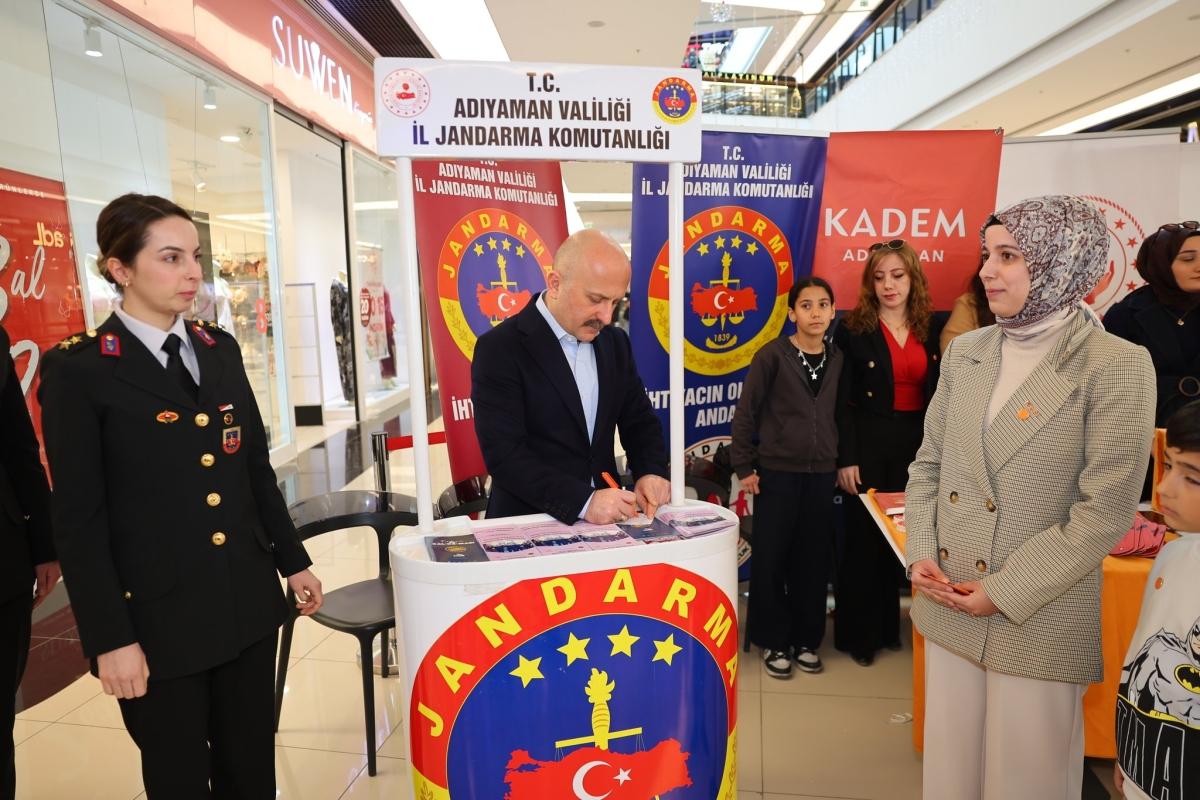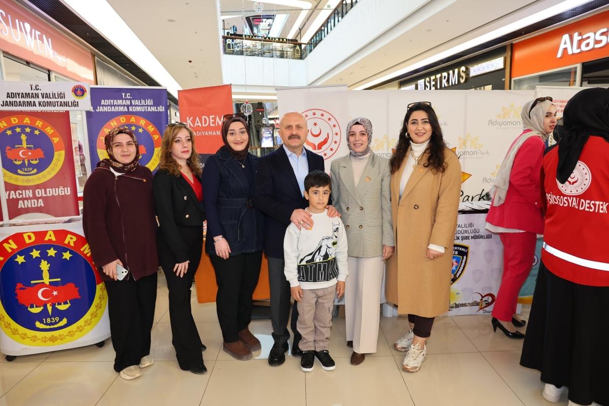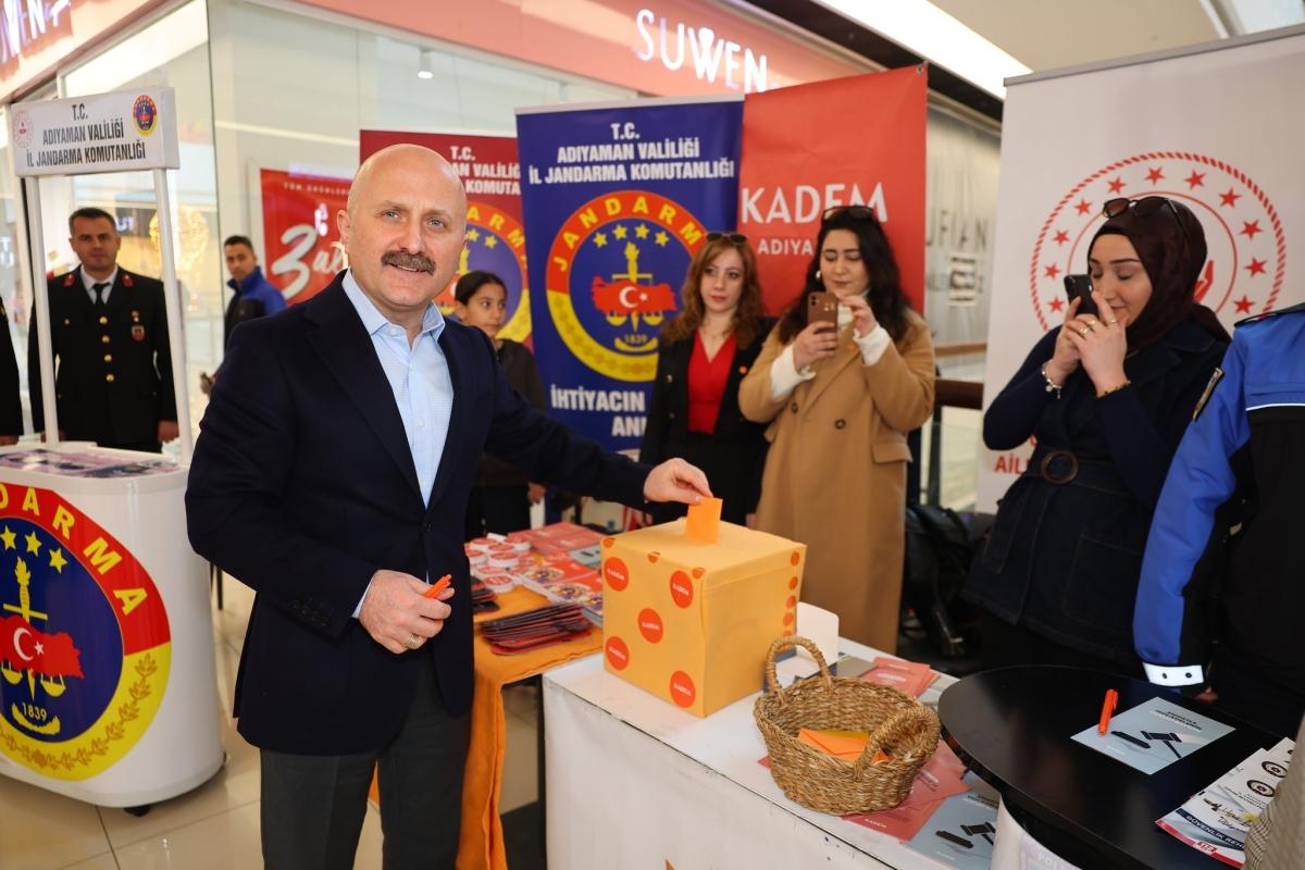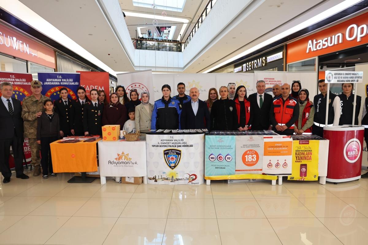 Adıyaman Valisi Dr. Osman Varol, İl Emniyet Müdürlüğü, İl Jandarma Komutanlığı, Aile ve Sosyal Hizmetler İl Müdürlüğü ile KADEM tarafından 8 Mart Dünya Kadınlar Günü dolayısıyla Park AVM'de açılan farkındalık standını ziyaret etti. Açılan stantta bilgilendirici broşürleri inceleyen Vali Varol, yetkililerden kadınların toplumdaki yeri, hakları ve toplumsal farkındalık konularında yürütülen çalışmalar hakkında bilgi aldı.