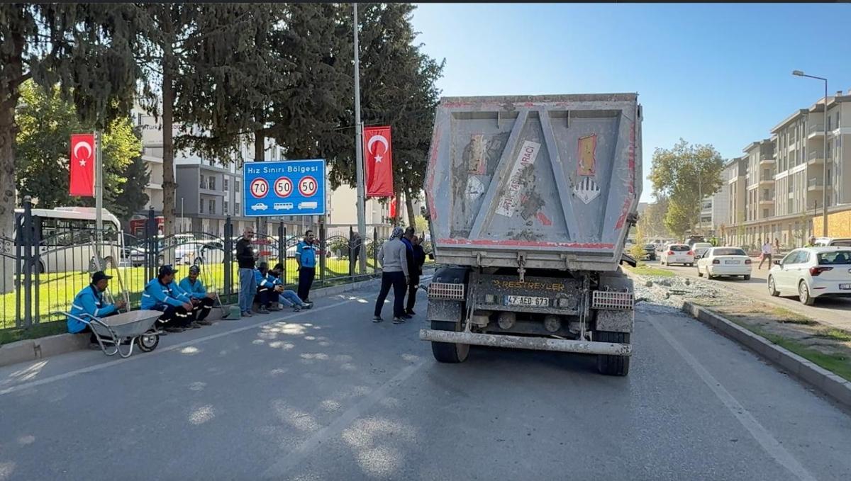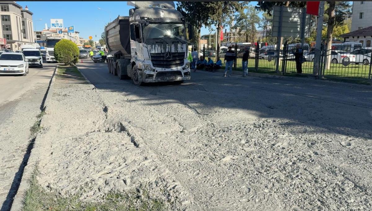 Edinilen bilgiye göre, olay Atatürk Bulvarı Saat Kulesi mevkiinde meydana geldi. Saat Kulesi mevkiinden Batı yönüne ilerleyen kamyonun dorsesindeki beton, sürücü Ahmet Elalmış'ın frene basmasıyla caddeye yayıldı. Olay, cadde üzerinde kısa süreli trafik aksamasına yol açarken, polis ve zabıta ekipleri tarafından güvenlik şeridi ile kapatılan alanda temizleme çalışmalarına başlandı.