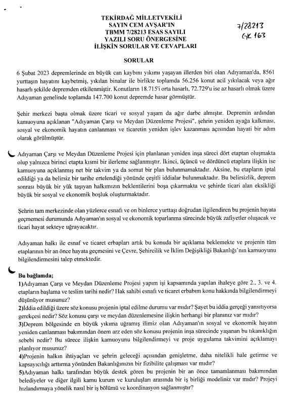 Tekirdağ Milletvekili Cem Avşar, TBMM'ye sunduğu 7/28213 esas numaralı yazılı soru önergesinde, Adıyaman'da deprem sonrası ortaya çıkan ağır tabloyu hatırlatarak, "Adıyaman halkı ve esnafı, şehrin yeniden ayağa kalkmasını sağlayacak olan bu projenin akıbetini merak ediyor" ifadelerini kullandı.