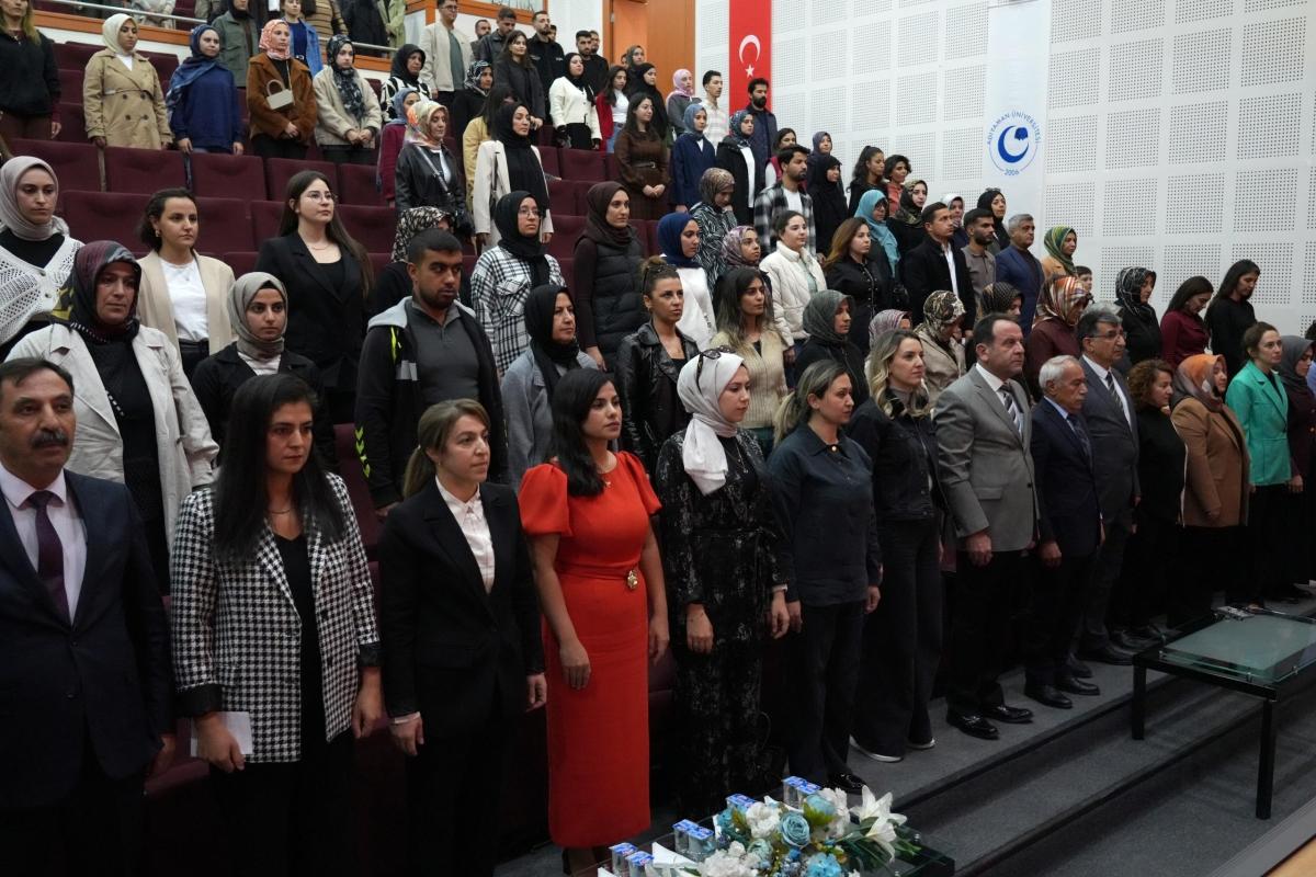 Saygı Duruşu ve İstiklal Marşı'nın okunmasının ardından ilk konuşmayı Adıyaman Üniversitesi Kadın ve Aile Çalışmaları Uygulama ve Araştırma Merkezi Müdürü Prof. Dr. Seval Kızıldağ Şahin yaptı. Prof. Dr. Şahin konuşmasında: